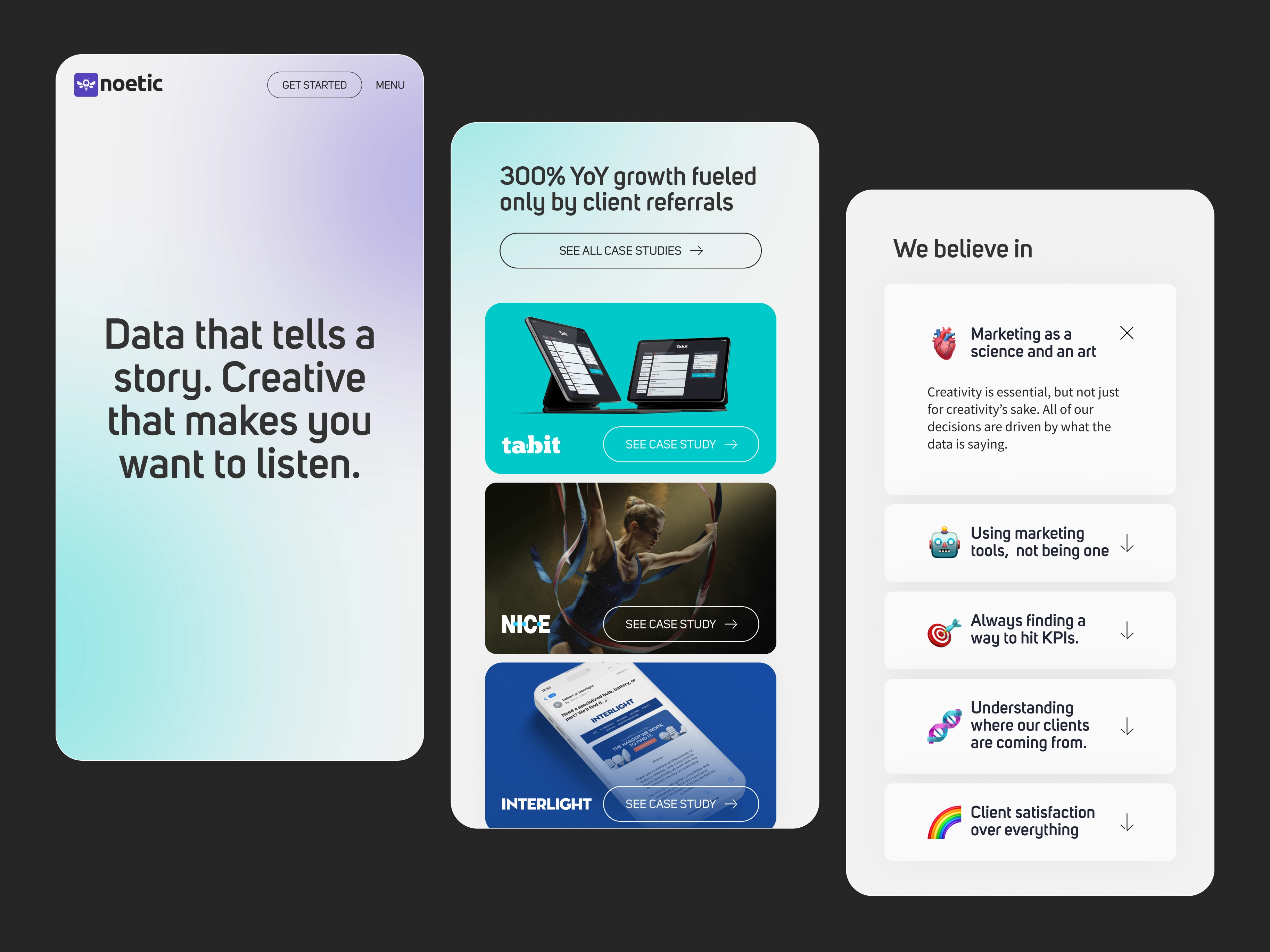 Without a clear narrative, strategic foundation, or cohesive visual language, the website couldn’t communicate Noetic’s value or support sales conversations. Before we could design a site that truly represented the agency, we needed to strengthen the brand at its core.